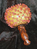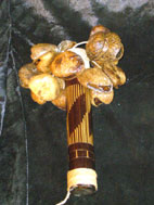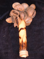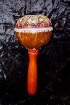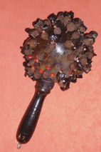 Rassel aus Kokosnuss, Fruchtkernen und Muschelschalen mit Holzgriff